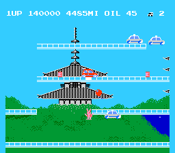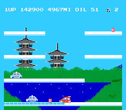 The last unique stage in the game is level 6. Once you pass this level you go to level 7, which actually has the same background as level 1 with a road setup similar to level 2 or 3. Anyway, I'll call this the last level and so will ShadowMan and Bub because we're all satisfied with a still of a guy in a white jumpsuit looking at the sun. At least I don't want to play for days on end searching for an end to this game. Oh yes. One more thing. Take a look at that little rabbit thing in the still on the left. It's directly below the car, for those of you with poor eyesight. What the hell is that thing? I only encountered it once in about a week of playing. Bub had no idea what it was either. I didn't run into it, so I don't know if it's good or bad...
