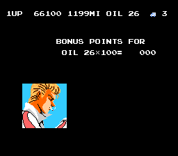 City Connection doesn't offer a lot in the way of mind-boggling graphics, but it is easy to learn and quite addictive. Of course, any game I enjoy has to have some cutesy touches. When your car crashes into something, the screen forms a circle of hearts around it. The music is also catchy (in an annoying way) and the cat/baby is also somewhat cutesy. There's also a funny scene at the end of the first level of your character reveling in his victory with a smooth Laramie cigarette.