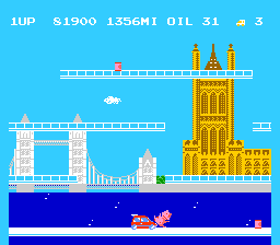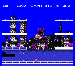 The first level gets the basics down of the City Connection experience. You have to cover the three levels of road with paint while dodging all obstacles and shooting the cop cars with paint cans. But be sure to watch out for the damn cat/baby! I call it a cat/baby because the manual says it's a cat, but it sure looks like a baby to me. Anyways, that thing is sure to pop up at any time, so you have to make quick movements to get away from it. It's also pretty difficult to finish the tips of the pieces of road, because if you don't jump right away you fall to a lower platform. The longer it takes you to finish the level, the more your jumping ability decreases. Also, look out for the balloons, if you snag three of them, it will warp you a level.