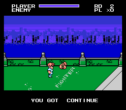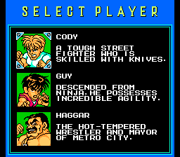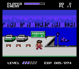 | This game is a little different from most of the beat-em-ups on NES for a few reasons. First off, it has experience points and allows the characters to gain levels. This sounds great in concept, but I really noticed very little change in the characters power once they advanced levels. The three different characters seem to have good variety, and each seem to have a stage they excel at. I also liked how you could change characters at the continue screen, and also the players level and experience points were kept even if you switched to a different character. Occasionally, barrels will roll across the screen, and you can punch them to gain bonus weapons or life-ups. I think the bonus weapons could have popped up a little more often however, since they were quite useful. Each character also has combo button attacks that are useful, but some of them drain life. (Haggars special move will probably remind you of one of Zangiefs attacks in Street Fighter). The bosses in the game are also unique from other games, since each will taunt you for a minute before you begin the fight. Sometimes they give you choices about the situation, which seem to have no effect on the outcome, considering you always end up fighting them. | ![]() |