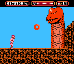 I could've swore I've seen something like this on G.I. Joe once. Anyhow, this thing shoots doughnuts at you and you must dodge and shoot beams at it's horn. Then it pulls back into the ground. I'm dazzled.